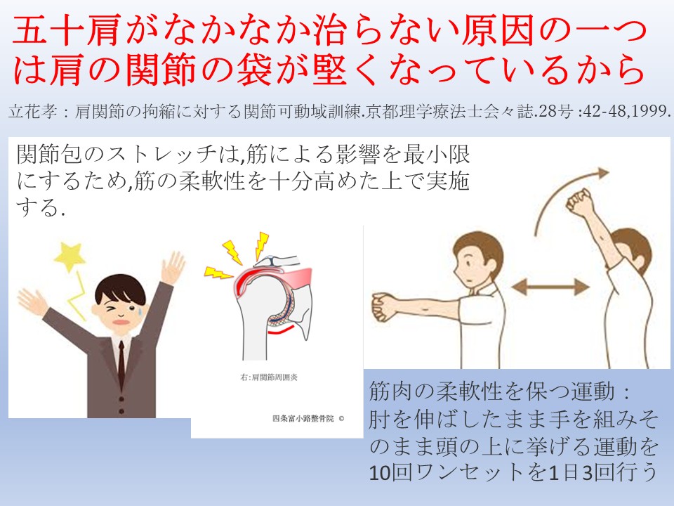 車や電車で通勤してデクスワークをしていると腕を挙げたり、後ろに回すことはないですよね。動かさないと関節は堅くなって拘縮してきます。立花先生の解説では五十肩、すなわち肩関節周囲炎の治療では堅くなった関節の袋をストレッチするためには,筋肉による影響を最小限にするため,筋肉の柔軟性を十分高めた上で実施すべきだと述べています。だから、普段から肘を伸ばしたまま手を組みそのまま頭の上に挙げる運動を10回ワンセットを1日3回行うなどをして筋肉の柔軟性を十分に高めておきましょう。